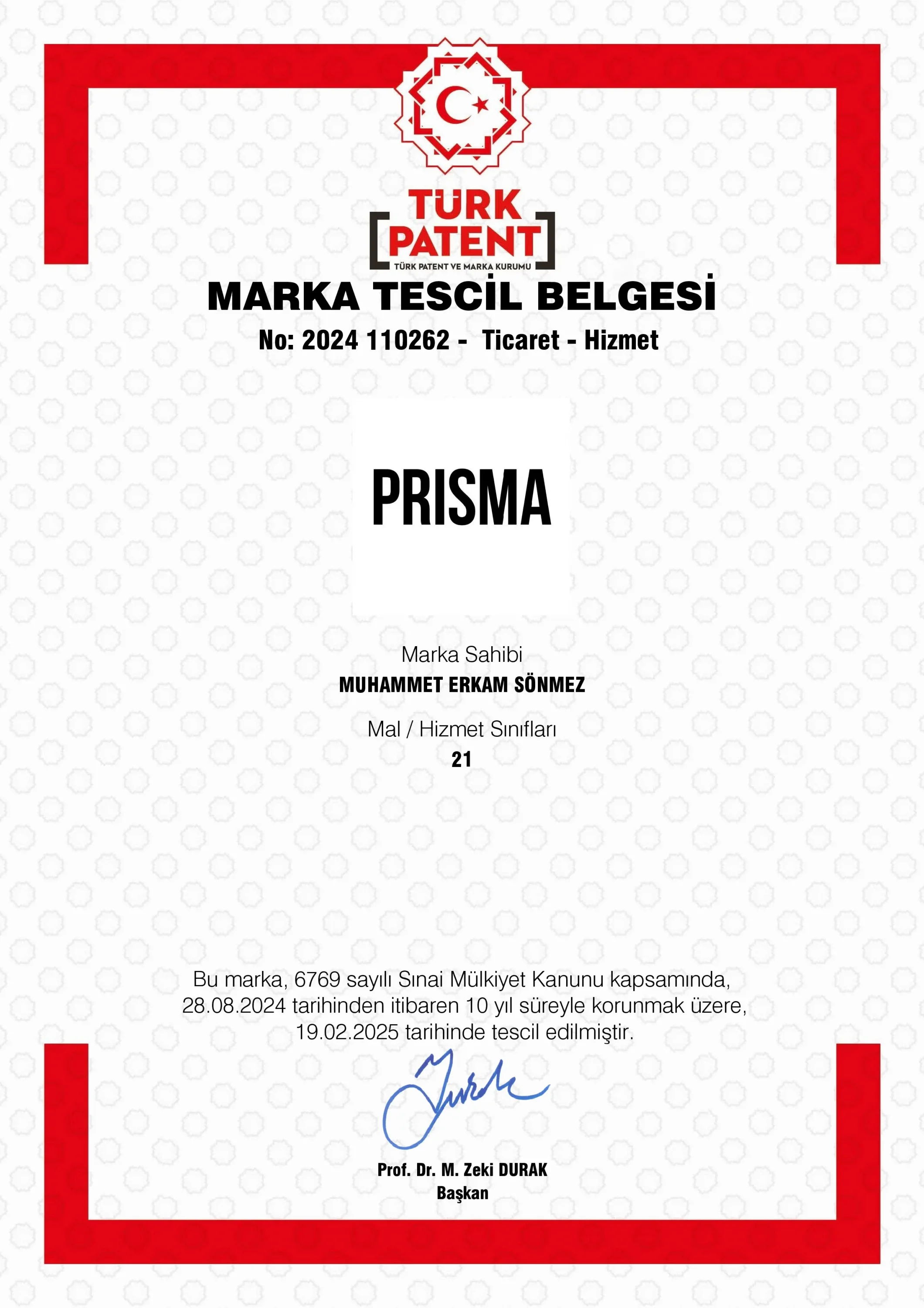 Prisma Marka Tescil BelgesiTürk Patent ve Marka Kurumu tarafından onaylı tescil belgemiz.